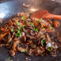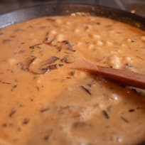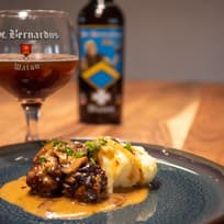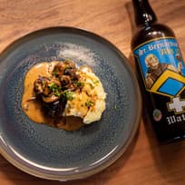 Es ist sicher kein leichtes Gericht (1l Sahne auf 4 Leute), aber gerade deshalb braucht es ein starkes Bier wie ein Quadrupel, das “dagegen halten” kann. Durch das Fleisch und die Pilze hat es sehr viel Umami-Geschmack, das Quadrupel bringt außerdem eine schöne süße Fruchtigkeit in die Sauce, die die Aromen gut ergänzt und unterstützt. Wer es nicht so süß mag sollte den Honig reduzieren oder weglassen.