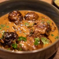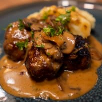 Das genaue Rezept möchte ich hier nicht aufführen, da es ja aus dem Buch stammt und von mir auch nicht angepasst wurde. Wesentliche Bestandteile waren Fleischbällchen (aus Rinder- und Schweinehack mit Sauerteigbrot), Pilze, karamellisierte Zwiebeln und eine Sahnesauce.